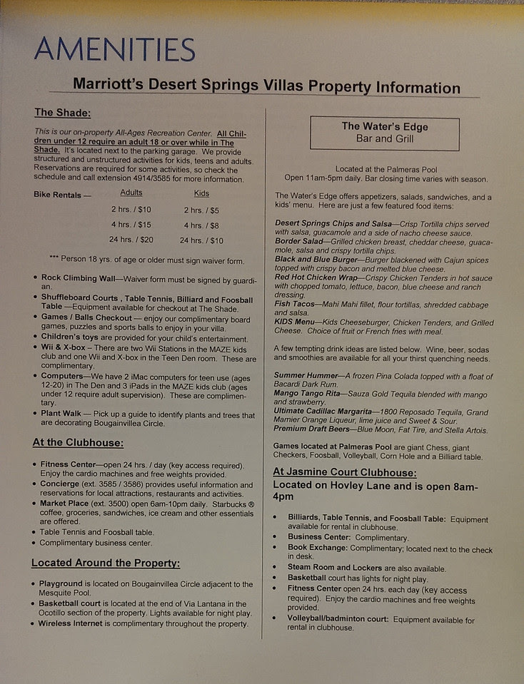 Timeshare Users Group Marriott boards, I see people asking all the time what the resorts offer in terms of amenities and daily activities so I've included this information below for Marriott's Desert Springs Villas I: